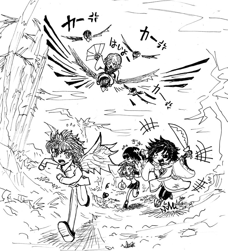 一番左側で逃げているのは、咲蒼さんの「ツバサ」というキャラクターです。 一番右側の剣を持って追いかけているのは、りくさんの「まだら」というキャラクターで、鳥の上に僕が勝手に乗っけてしまったキャラクターも、りくさんの「ひよ松」、僕のキャラクターの(ウサギ)の上に乗っているのも、りくさんの「チュン太」です。 僕が描くとこんな感じになってしまいますが、 咲蒼さんの絵は、自然と人を調和させるような、女性らしいとても奇麗な絵を描きます。 りくさんの絵は、プロも唸りそうな形を作り出し、とても素晴らしいバランスの物を描きます。 よろしければ、お足をお運び見に行ってみて下さい。 咲蒼さんのブログ http://sakusakuso.blog36.fc2.com/ りくさんのブログ http://riku5385.ichi-matsu.net/ |