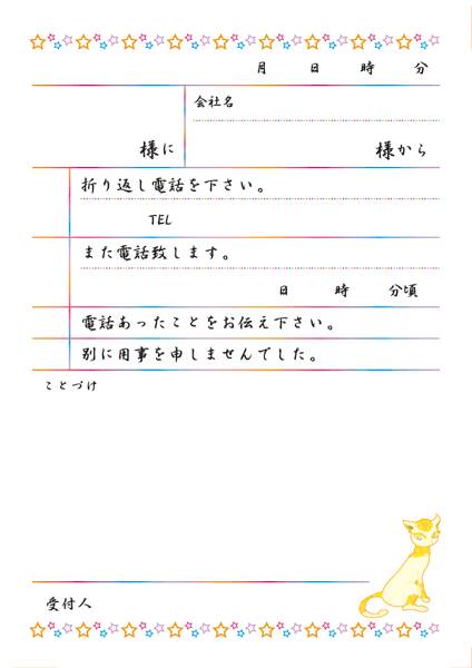 (=^∪^=)完成しました** ぼくのハッピープレゼントのコーナーから無料で印刷できるので、 (<゜∀゜)/お気軽にお使い下さい☆ 【ハッピープレゼント】◀押すと移動できます ーーーーーーー☆☆☆ーーーーーーー 電話メモのデザインはこんな感じです♪ ▼見本(写真を押すと拡大します ーーーーーーー☆☆☆ーーーーーーー いつもありがとうございます☆ おかげ様で(=^∪^=)まだまだがんばれます** にほんブログ村